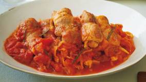 おもてなしにも使える、おしゃれな洋風料理です。一見“和”の食材である切り干し大根ですが、トマトと相性がよくてびっくり!豚肉とトマトのうまみがよくしみ込んで、意外なおいしさを発見できます。ロール状に巻いた豚肉は薄切りなのにボリュームが出て、柔らかい口当たりに。