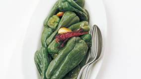 にんにくと赤とうがらしがきいたピーマンの蒸し煮。温かいままでも、冷やしてもおいしくいただけます。