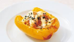 ベーコンとたまねぎと生クリーム入りの卵液の味わい。ジャンボピーマンをキッシュの皮に見立て、焼き上げました。