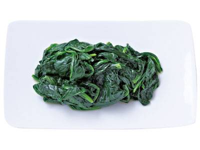 ほうれんそうは柔らかい口当たりにするために、葉の部分だけを使って。余分な水けはしっかりきってから皿に盛りましょう。