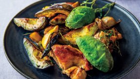 ジューシーなチキンとこんがり焼いたアボカドが織りなす至福の一皿。レモンの香りがアクセント。アボカドは食べるときに皮をむいて。