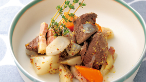 柔らかく煮込んだ肉と野菜を、相性抜群のマスタードであえた「煮込みサラダ」。うまみがギュッと凝縮されたゆで汁も「飲むサラダ」として添えましょう!
