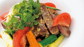 アルミ箔(はく)に包んで焼けば、絶妙に火が通った牛たたきのでき上がり!華やかな肉サラダは、おもてなしにもぴったりです。