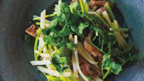 野菜には少量の塩だけ。肉にはオイスターソースをしっかりとからめてメリハリをつけ、パクチーのおいしさを引き立てます。