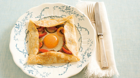 ガレットの生地に加えた牛乳が、ほんのりとした甘みもつけ、食べやすくします。そば粉独特のふうみは生かしつつも、くせを抑えます。