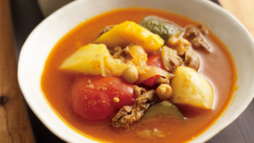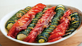 トマトやズッキーニから出た水分は、どんなソースにも負けないほどのおいしさです。生ハムの塩けがアクセントに!