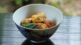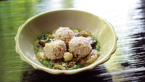 豆腐を合わせてふわふわに仕上げた鶏だんごに、かんぴょうの食感がアクセント。あんに入れたしめじが、味に深みを出します。