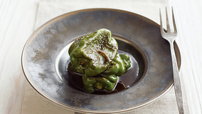 ピーマンをヘラで押さえながら焼くと、均一に火が通ります。じっくり焼いて甘みが増した種も美味!