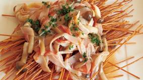 スパゲッティを柔らかめにボイルしてつくる、洋食店風の冷製パスタです。「富士の介」はサクのまま、表面だけサッと湯通しするのがコツ。辛みを効かせたトマトソースがよくからみます。ロゼのスパークリングワインとの相性抜群です!