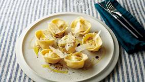 詰め物をした小型のパスタ・トルテリーニをヒントにした1品です。皮はもっちり、あんはクリーミー。仕上げのひとふりでおいしさが広がります。