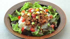 カイエンペッパーやクミンを使ったタコライス風の一品。ピリ辛風味がトマトの甘み、酸味とよく合います。