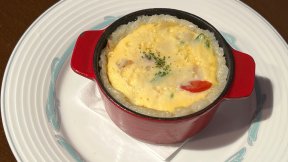 もち米を生地にした簡単キッシュ風。プルッとした卵と、もちもちの生地は驚きの好相性です!野菜のうまみをチーズの塩けが引き立て、ビストロ風のワンランク上のキャンプ飯に!