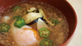 さばは、中骨のないものを使えば、扱いもらく!なすと一緒にじっくりと焼いて、甘辛いたれをからめます。秋の満月に見立てた温泉卵をトッピング。