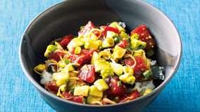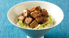 濃厚で香り豊かなごまだれを、たいの刺身にしっかりからめて丼に。たいの甘みがグッと引き立ち、ワンランク上のおいしさです。