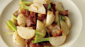 皮付きのまま炒めた新じゃがいもに、たこのうまみ、にんにくの風味をプラスしておいしさ倍増。ビールにも、白ワインにも合います。