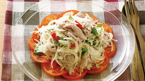 たっぷりのたまねぎと牛肉が主役のサラダ。甘酸っぱいドレッシングに、にんにくと赤とうがらしを加え、エスニック風の味わいに仕上げました。