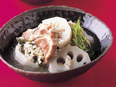 塩豚を手づくりし、れんこんと煮込んだスープです。雑穀を加えると自然なとろみで温まり、満足感もアップ。