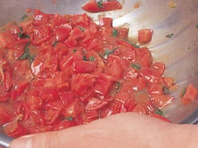 フレッシュトマトのソース。オリーブ油とトマトから出る水分をしっかりと混ぜ合わせましょう。