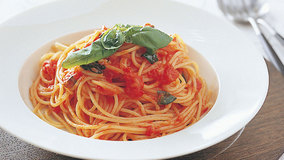 トマトの水煮を煮詰めるだけの、いちばんシンプルなパスタです。仕上げのパルメザンチーズとバジルが、トマトの甘みと香りを引き立てます。