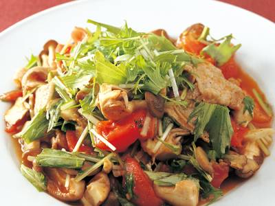豚肉とトマト、きのこから出てくる、うまみたっぷりのソースを水菜によくからめてどうぞ。