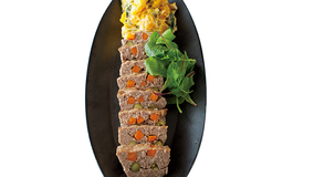 牛肉と豚肉のうまみが凝縮されたミートローフです。ピクルス、にんじんが彩りと味のアクセントに!