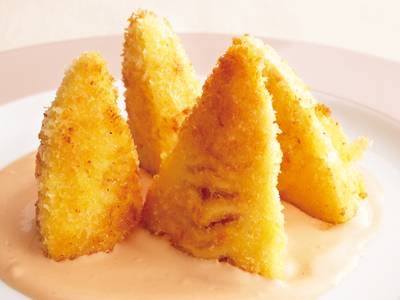 すでにゆでてあるたけのこは、衣がカリッとしたら焼き上がり。混ぜるだけの簡単ソースも、下に敷くとグッとおしゃれなります。
