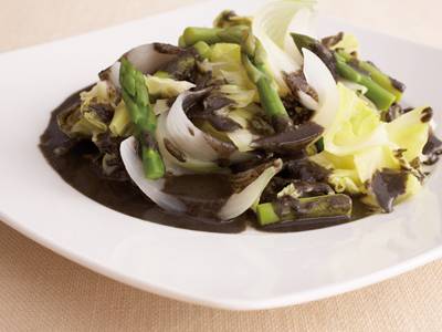 真っ黒なソースの上に、真っ白なうどと赤いえび。色と味のコントラストが楽しい、シックな一皿です。