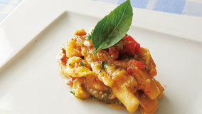 たっぷりのなすと、ベーコンをトマトでまとめたソースを、ペンネがしっかりと受け止めるボリュームのある一皿。