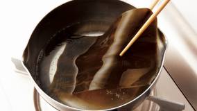 二番だしは、一番だしで取り出した昆布と削り節を水から煮出し、新たに削り節を足して風味を補います。