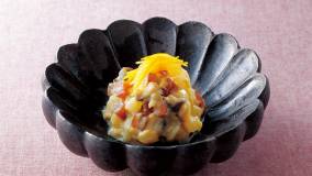 うどの白さに木の芽みその緑が映え、見た目も爽やかな一品。うどと木の芽、ふたつの香りのハーモニーをお楽しみください。