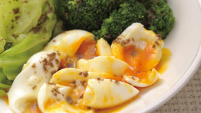 半熟卵はあえてラフにくずしましょう。アンチョビの塩けとまろやかな黄身のおいしいソースがゆで野菜にからんで絶妙のおいしさです。