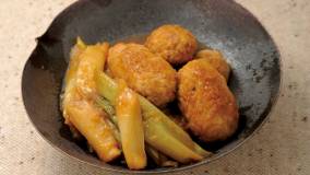 ふんわり鶏つくねに、トロリと柔らかく煮えたねぎにしょうがをきかせた煮汁をからめていただきます。