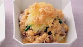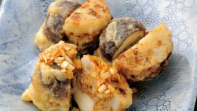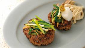 れんこんとしいたけで肉ダネをはさみ、少ない油で揚げ焼きにします。香りたつ”ねぎしょうがだれ”が絶妙です。
