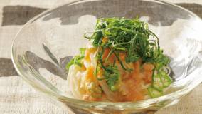 酢と梅干しを加えた塩もみ野菜に豆乳を加えると、マヨネーズのようにトロリとからみます。糸寒天は戻さず混ぜるので気軽で嬉しい。食感も弾力があって楽しめます。