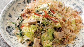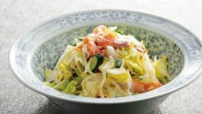白菜の内側の部分は生のまま食べて、柔らかさと甘みを堪能。サーモンを合わせると、ごちそうサラダに!