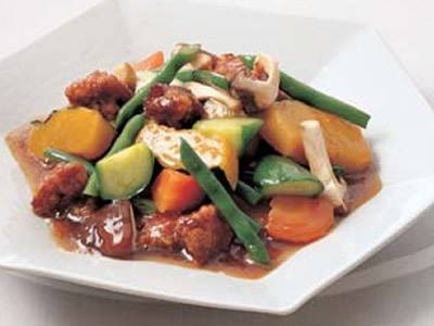 揚げ豚とゆでた野菜を甘酢あんでからめました。