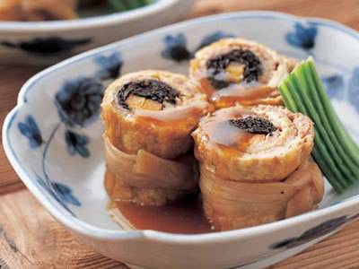 ねぎの間に豚肉をはさんでからりと揚げて、ウスターソースでいただきます。揚げたねぎもなかなかおつですよ。