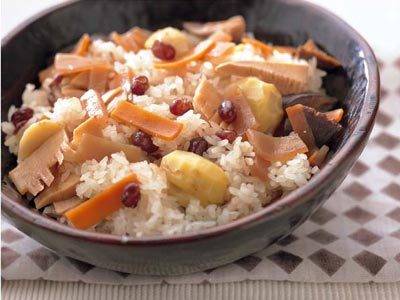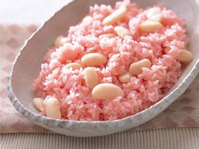 もち米を梅酢で色づけ、白いんげん豆を散らして紅白に。お祝いごとで喜ばれるおこわです。