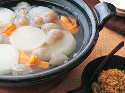 大根の甘さとみずみずしさを楽しめる鍋です。特性のごまみそ、肉みそをつけていただきましょう。