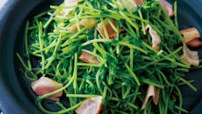 バターじょうゆの香ばしい風味とベーコンのうまみで、豆苗がガッツリ食べられます。ご飯のおかずはもちろん、お酒のつまみや朝食にも喜ばれます。