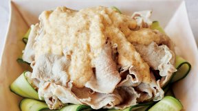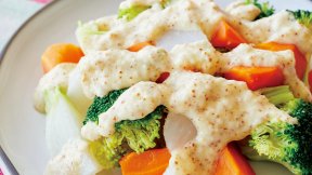 肉を1枚ずつ丁寧にゆでて、にんにく風味のマヨソースでおかずサラダに。ブロッコリーとしめじも豚肉と同じ湯でゆでると、うまみがひと味違います。