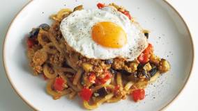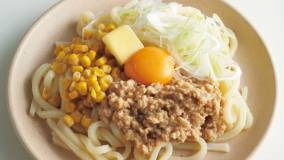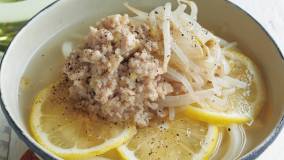 電子レンジで肉そぼろをつくって、アツアツのうどんにトッピング。シャキシャキしたもやしの歯ごたえと、レモンの爽やかさをプラスして。