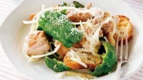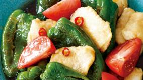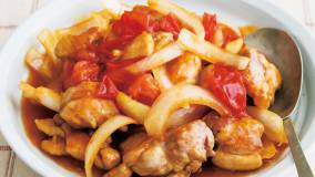 かたくり粉をまぶして焼いた鶏肉は、ふっくらとしてジューシーな仕上がり。甘酸っぱいトマトの果汁と酢豚風のたれがトロリとからみます。