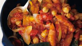 相性のよいミニトマトと豚肉の香り豊かな洋風煮。うまみが凝縮された煮汁も絶品なので、ぜひパンにつけて楽しんで!