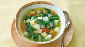 たっぷり野菜とベーコンのうまみで、スープの素(もと)も不要。仕上げに加える菜の花が、定番スープを春色に。