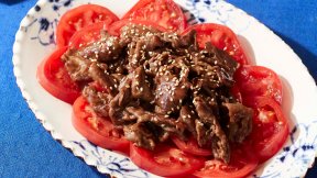 みずみずしいトマトに甘辛い牛肉をのせた一品。ひんやり&アツアツのコンビネーションがたまりません!