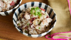 福井県名物の「焼きさば」を簡単に再現し、炊き込みご飯の具として使います。香ばしく深い味わいのさばと、梅干しの酸味が好相性です。