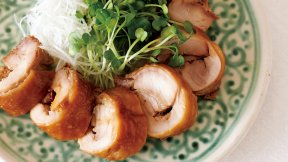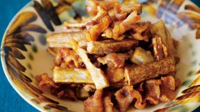 ごぼうは皮に香りとうまみが含まれるので、皮をこそげ落とさずに手羽中とともに香ばしく焼きつけます。甘酢をからめると、白いご飯が恋しくなる、秋のごちそうのでき上がり!