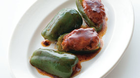 ピーマン一切れに肉ダネをたっぷり詰めるのが、おいしそうに焼けるコツ。最後まで下向きのまま蒸し焼きにします。