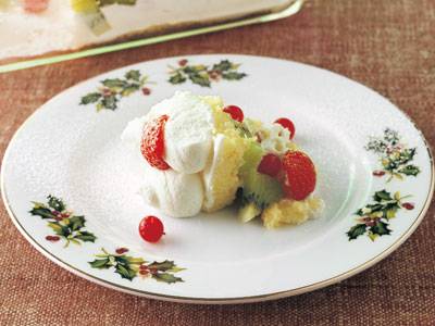 カスタードクリームを使うトライフルを、生クリームでアレンジ。スプーンでザックリと取り分けてどうぞ。